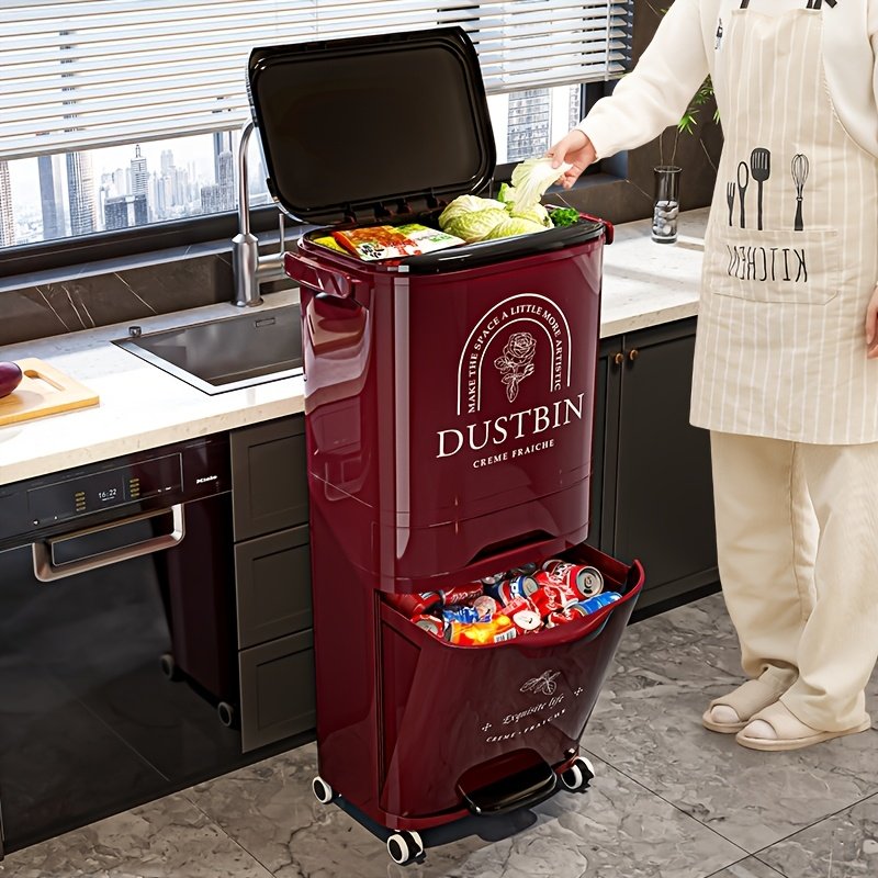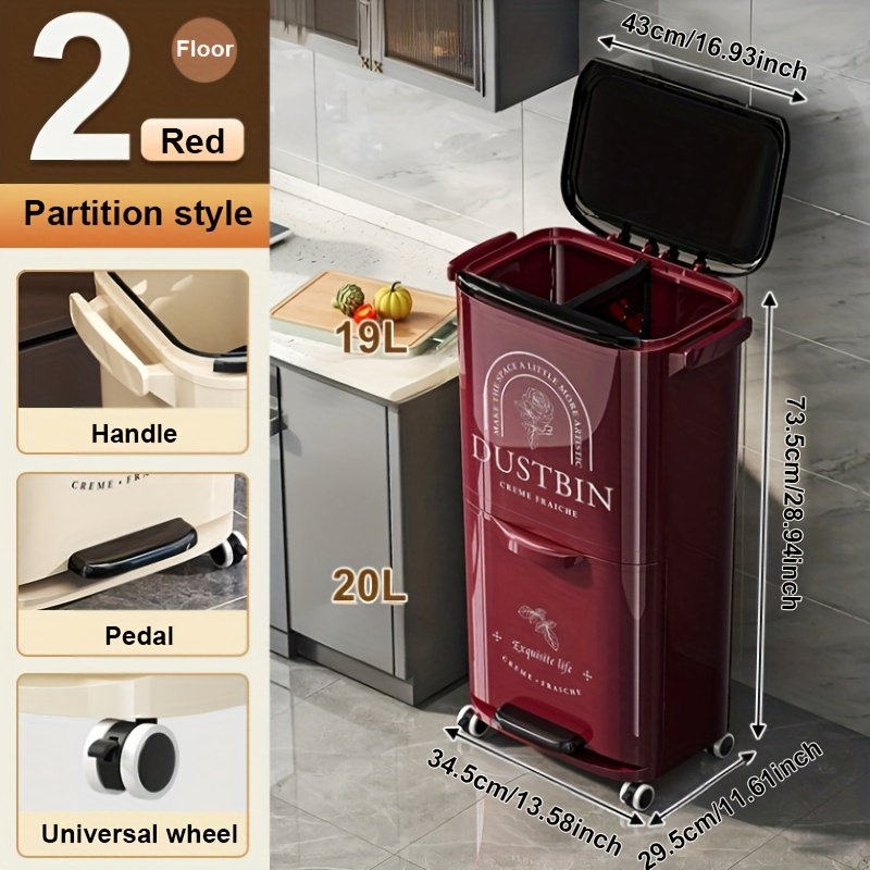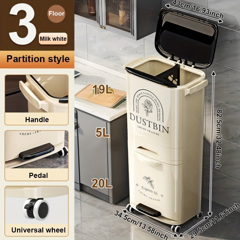 Specification: 1pc Large Capacity Heavy-Duty Kitchen Trash Can with Foot Pedal Lid & 2-3-Tier Storage Compartments – 39L-44L Heavy-Duty PP Rectangular Bin with Locking Mechanism, Manual Operation, Durable Polypropylene Construction for Home, Office, Commercial Use – Space-Saving Design, Odor Control, Easy Rollable Mobility (No Electricity Required) – Ideal for Wet/Dry Waste Sorting