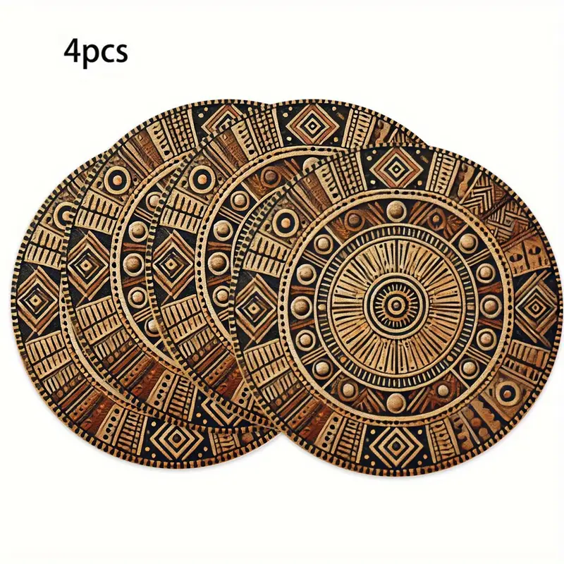 4pcs African Mud Cloth Round Placemats – 15-Inch Handmade Table Mats with Earthy Tones and Traditional Geometric Patterns, Perfect for Kitchen, Dining Room, and Party Decor, Textured Tableware