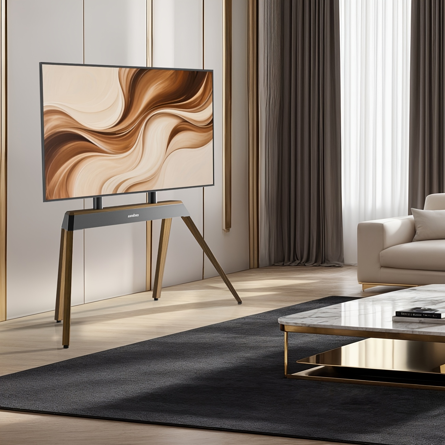 Whether you’re looking to elevate entertainment area or create polished presentation setup, this floor TV stand blends form and function, offering a sophisticated solution for both home and office environments. Its durable construction ensures a stable and secure support for various TV sizes and weight up to 50kg, coupled with its stylish trapezoidal design, makes it an excellent investment for anyone seeking to enhance their viewing experience while maintaining a high standard of quality and ae