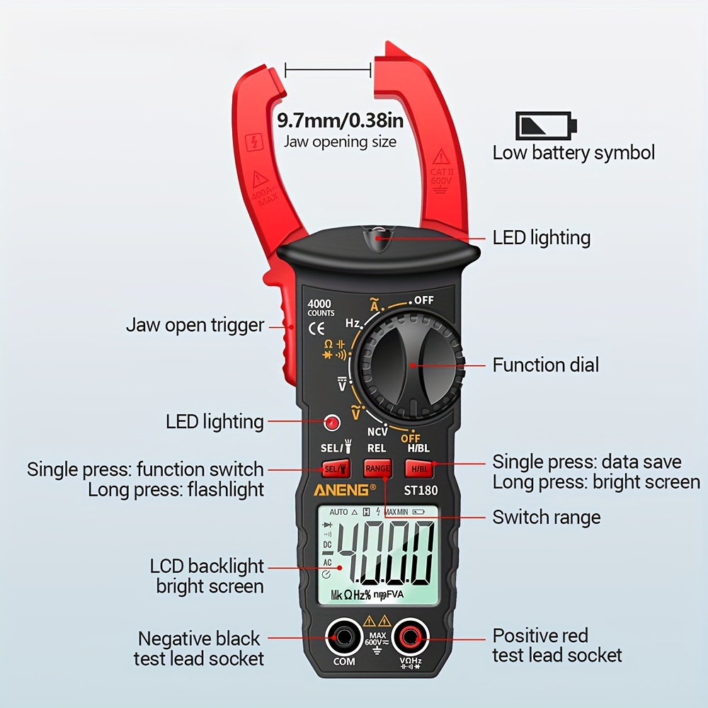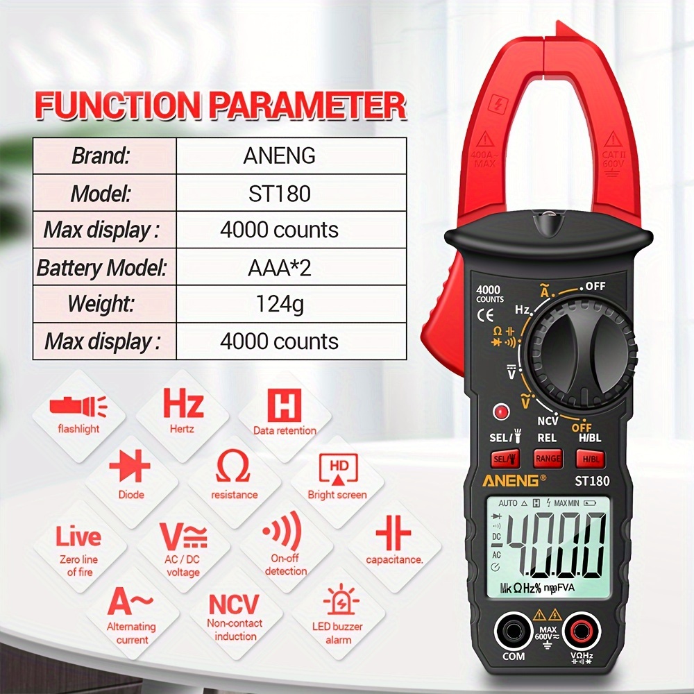 Specification: [Clamp Multimeter] 4000 Counts ST180 Clamp Multimeter Kit | Current Meter, Test Pen, Flashlight, Buzzer, Measuring Current, Voltage, Capacitance, Resistance, NVC Detection, Diode Continuity, Duty Cycle (AC Current) – Does Not Support DC