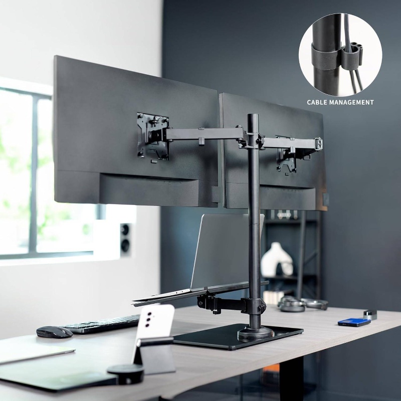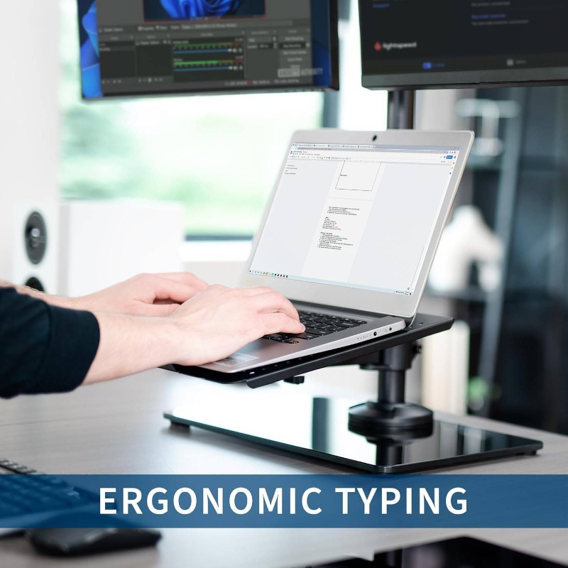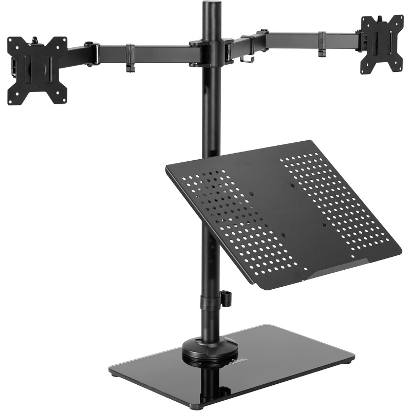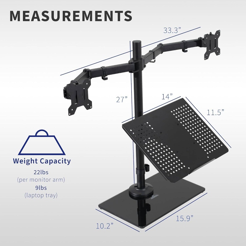 Freestanding Dual Computer Monitor and Laptop Combo Desk Stand with Glass Base, Fits up to 32 inch Monitors and 17 inch Laptops, Black, STAND – V003FGL