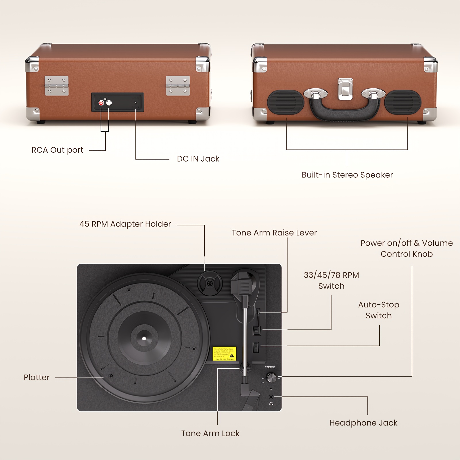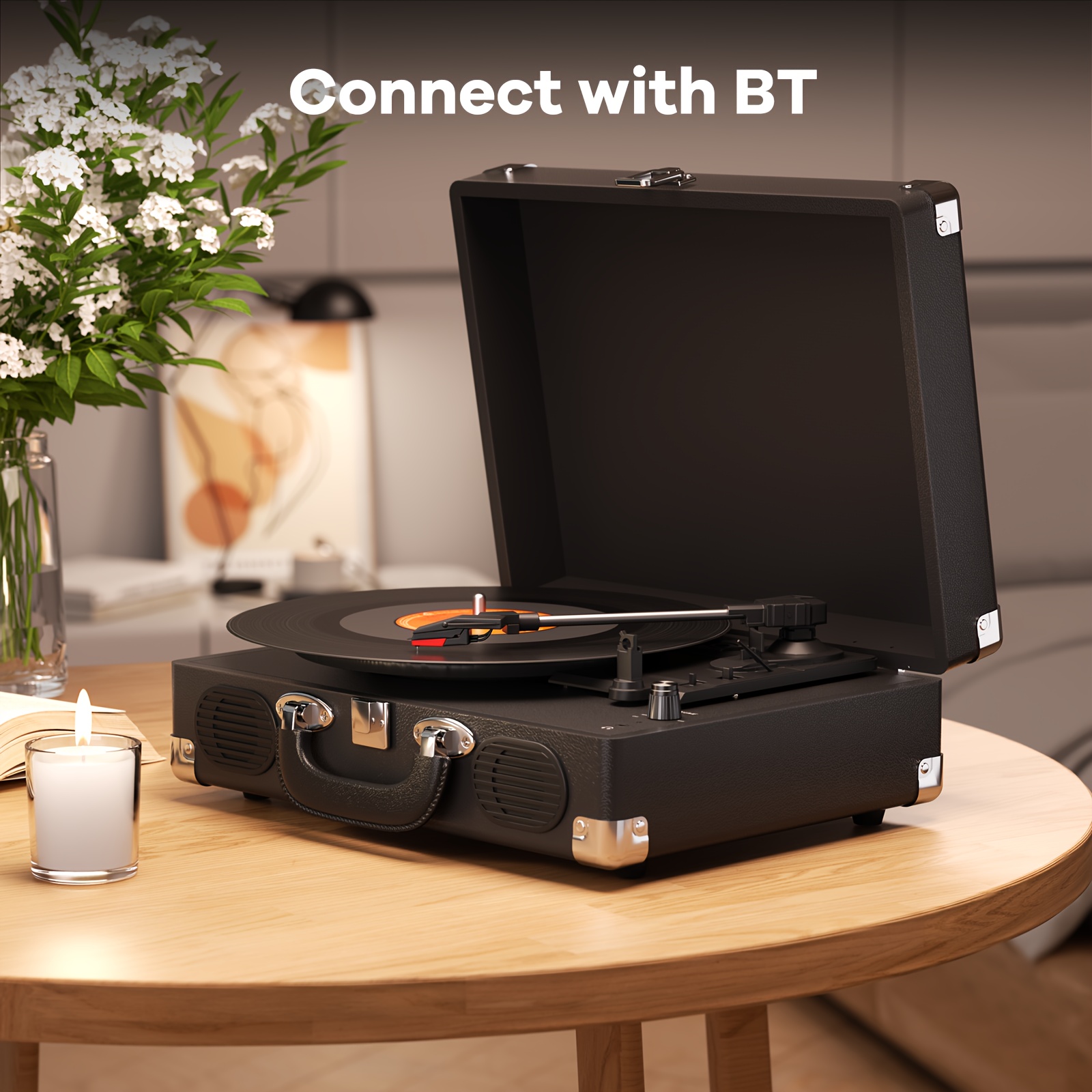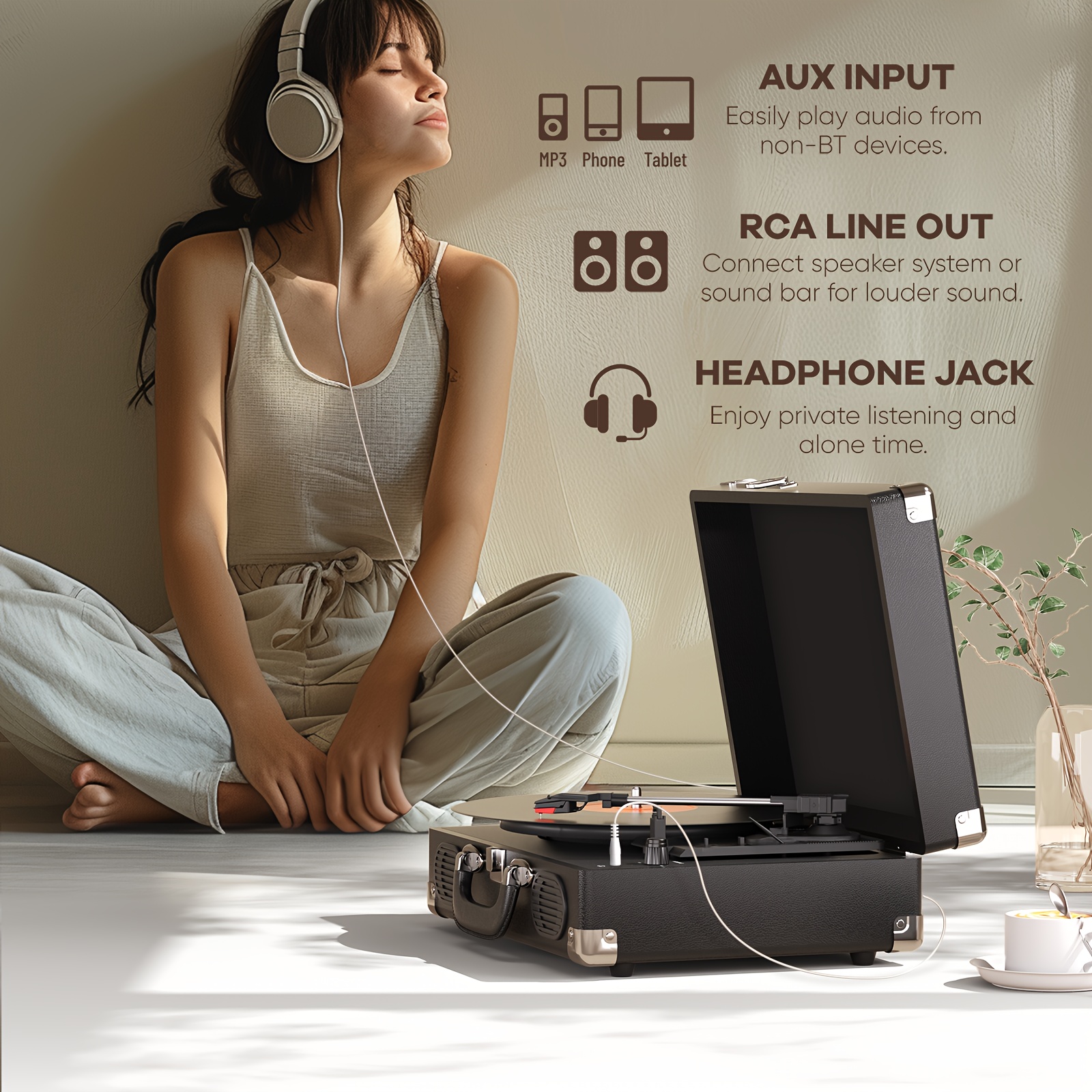 [Four Available Connection Choices]Music streaming digital audio via turntable built-in Wireless speakers. Hook up external speakers through RCA output or Aux-in line for non-BT devices like MP3. You can use your headpho
