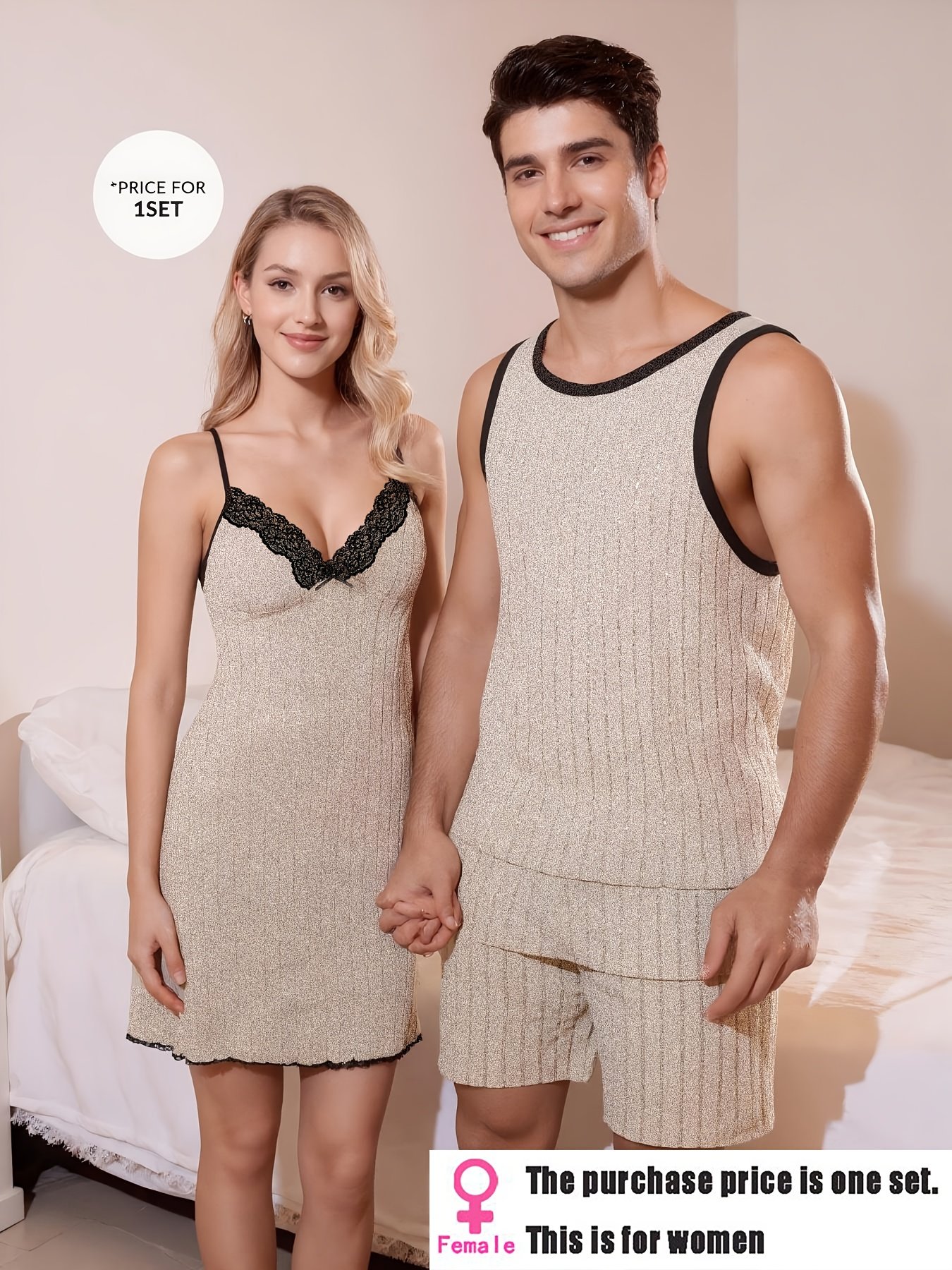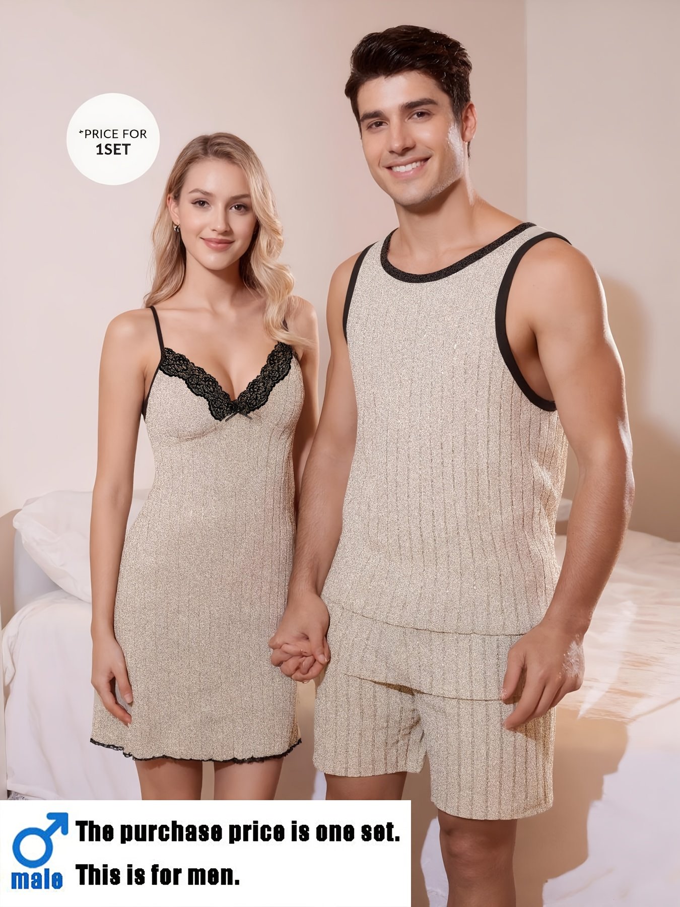 [Men/Women]Couple Style Outfit – Sleeveless Vest & Shorts Set for Men Or Lace Patchwork Camisole Skirt for Women
