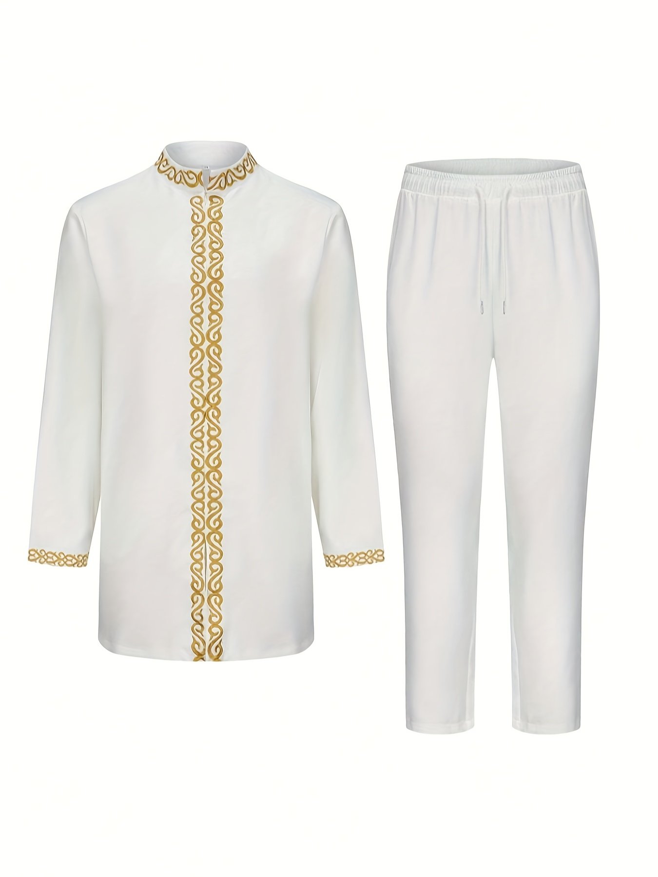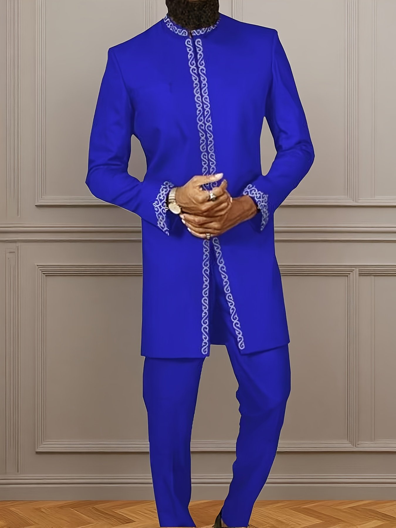Specification: Men’S Vibrant Blue Traditional African Embroidered Suit – Slim Fit, Long Sleeve, Round Neck, Polyester Blend for Weddings, Parties & Casual Wear, Party Attire, Intricate Embroidery