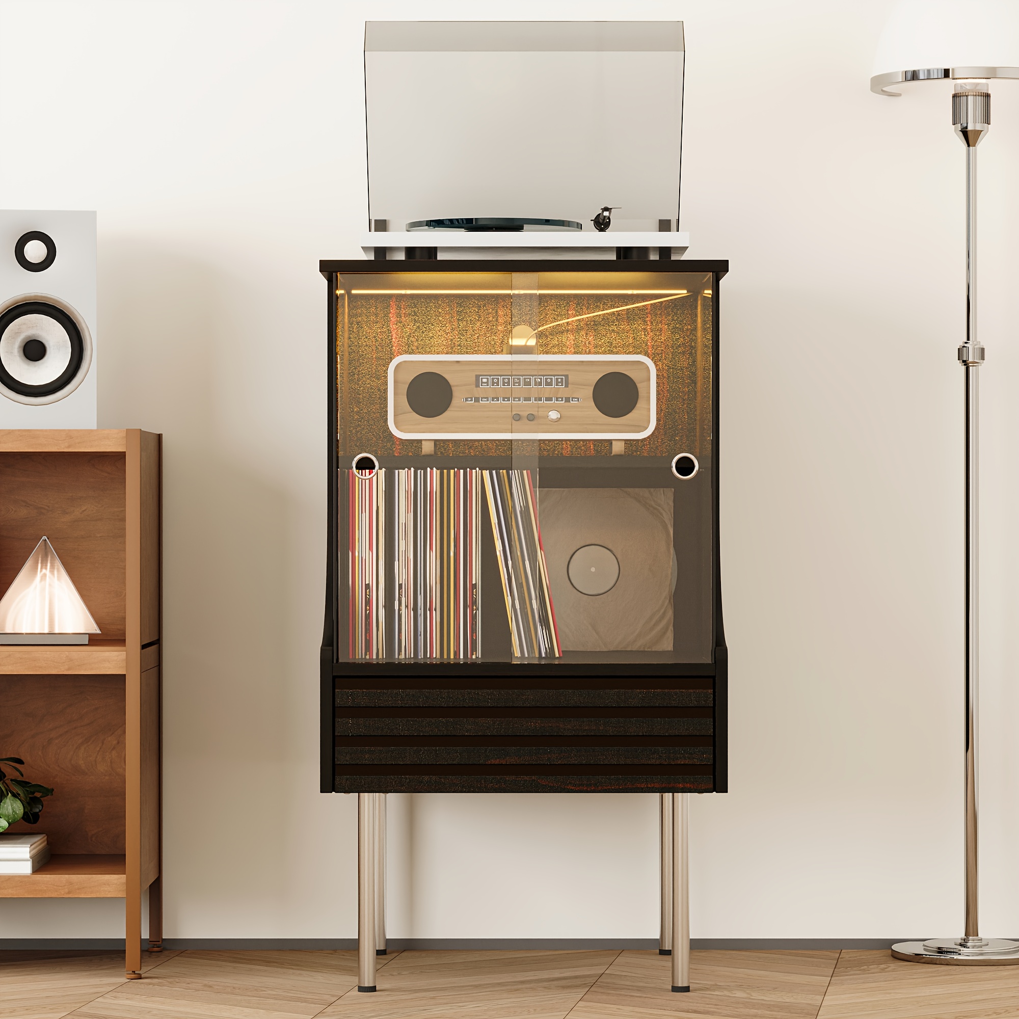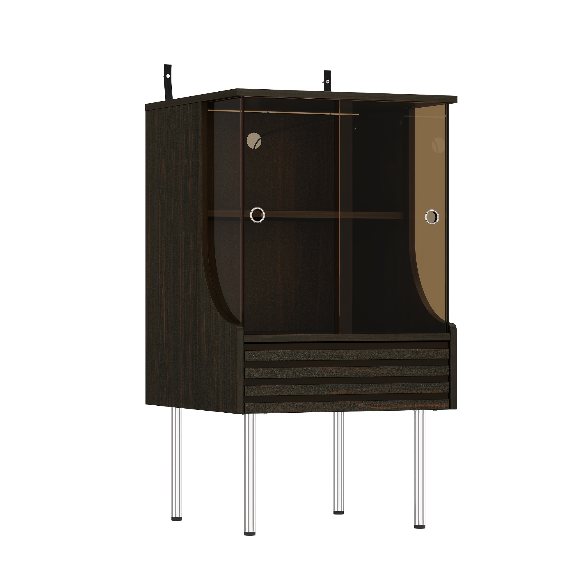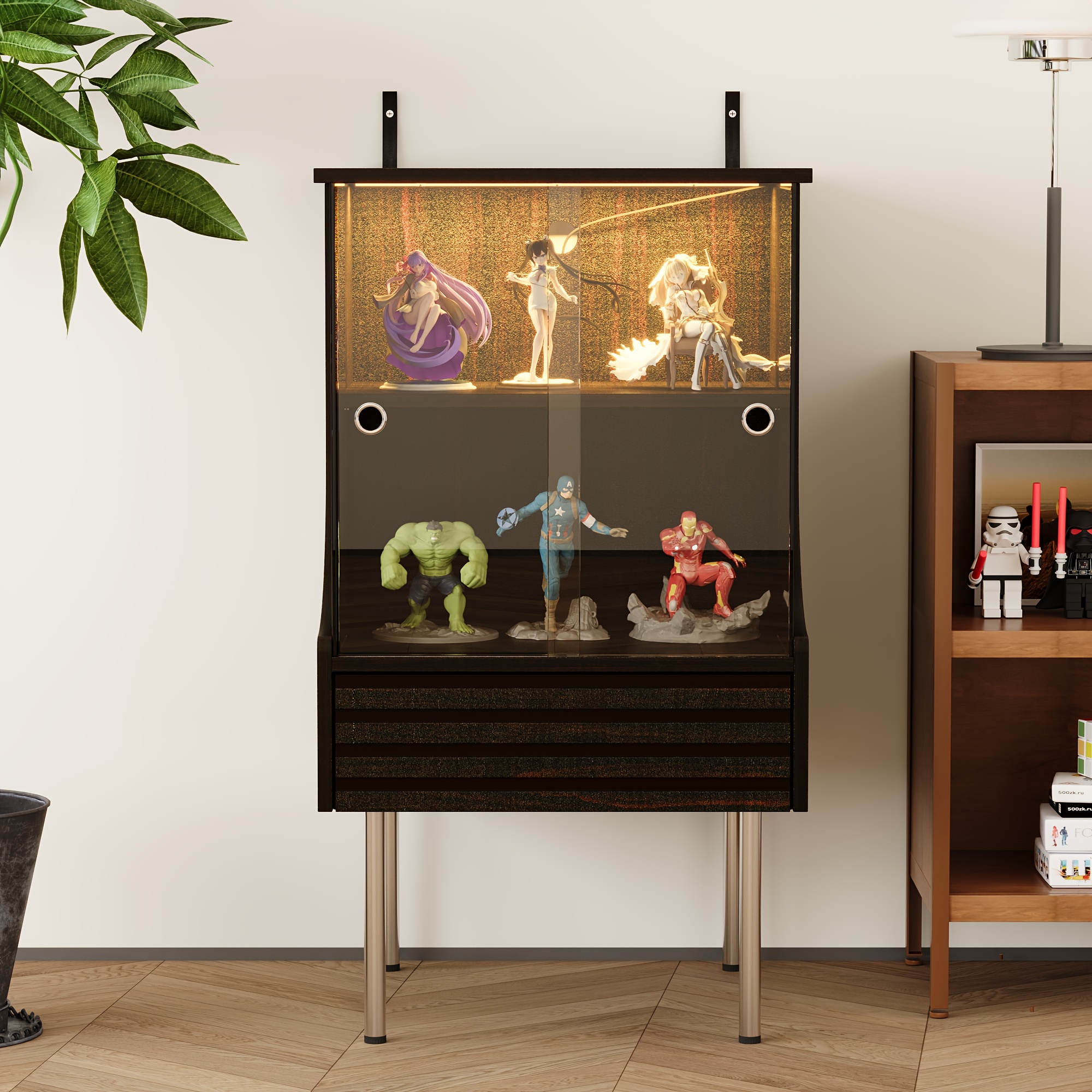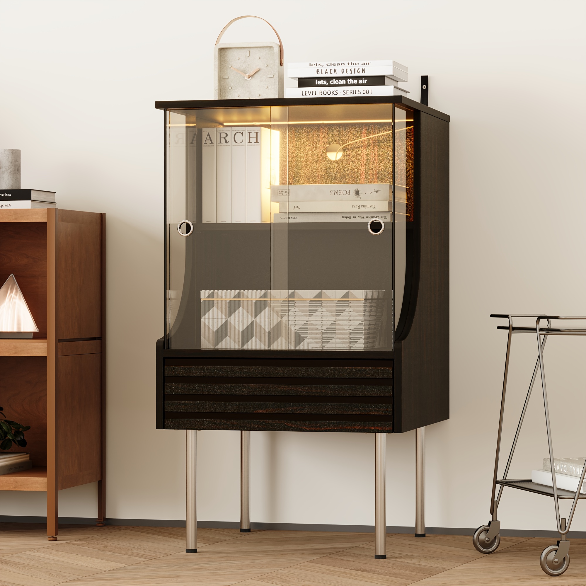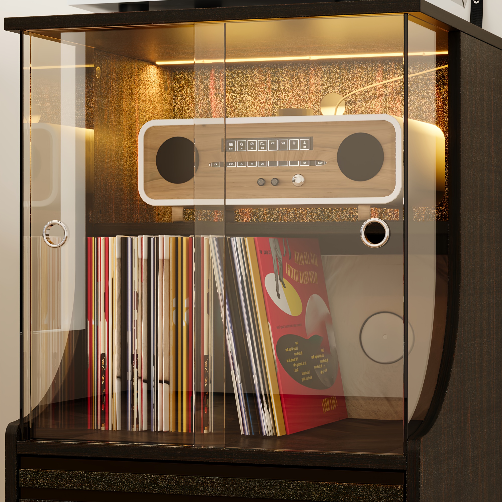 Dust protection and display equilibrium: The amber-hued glass sliding door effectively prevents dust from entering while allowing equipment visibility.