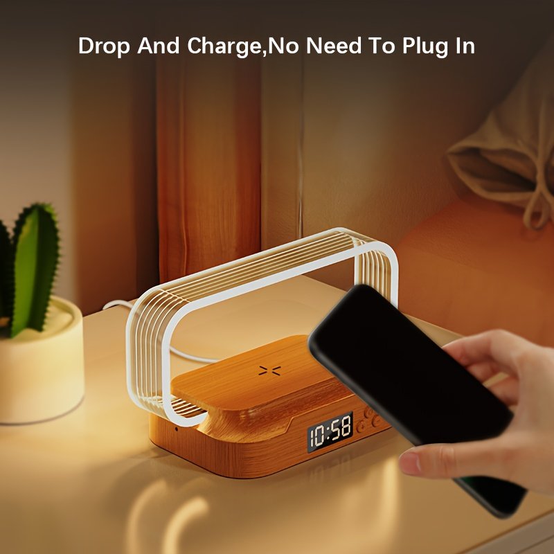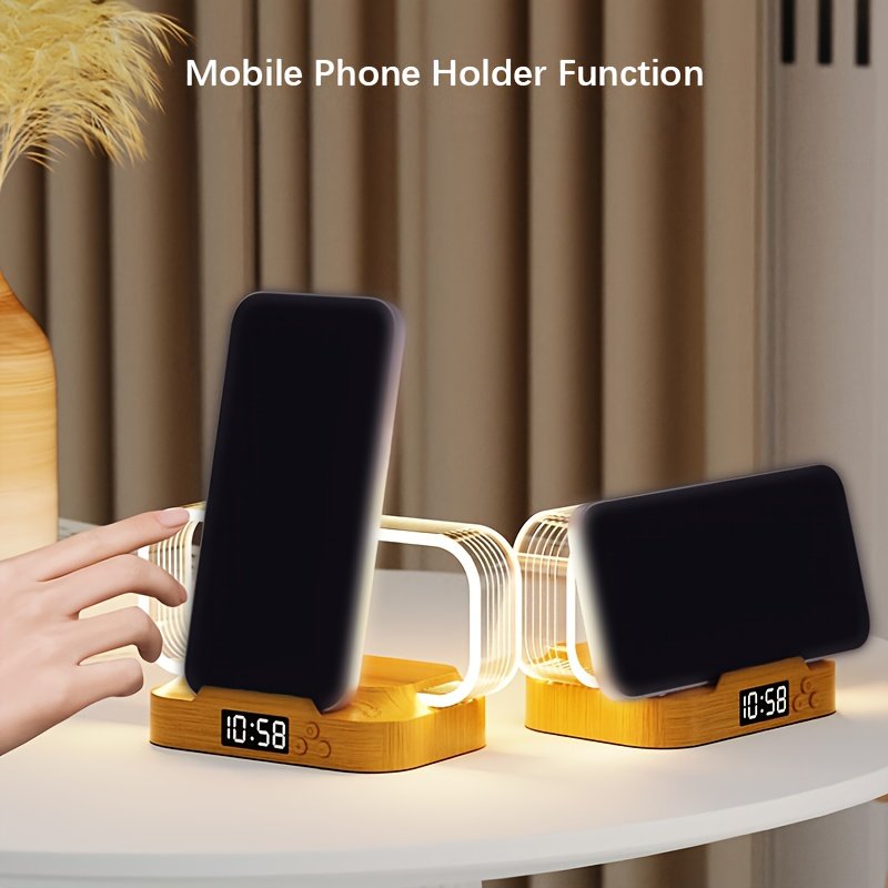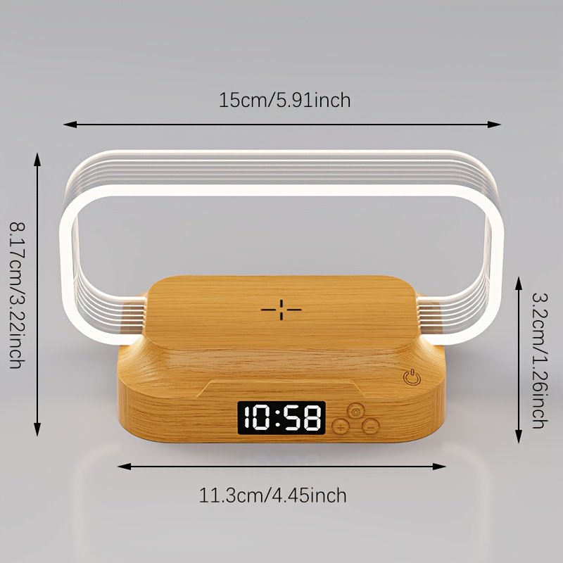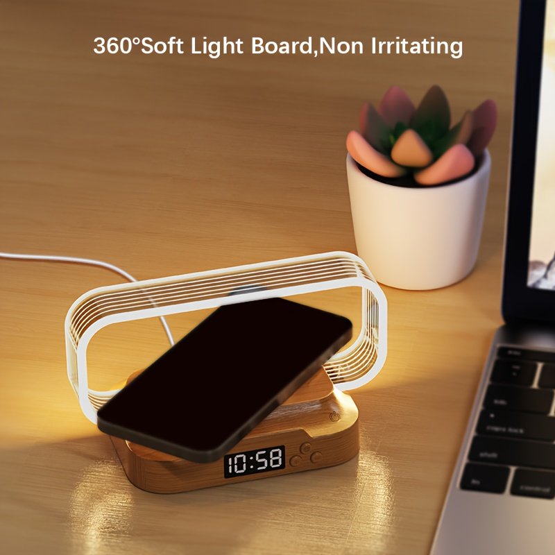 Key Features:All-in-One FunctionalityDigital Clock:• 12/24H format For Switch (hold 3s)• Separate time/brightness adjustmentQi Wireless Charger:• 15W fast charge (auto-alignment)Phone Stand:• Adjustable horizontal/vertical angles