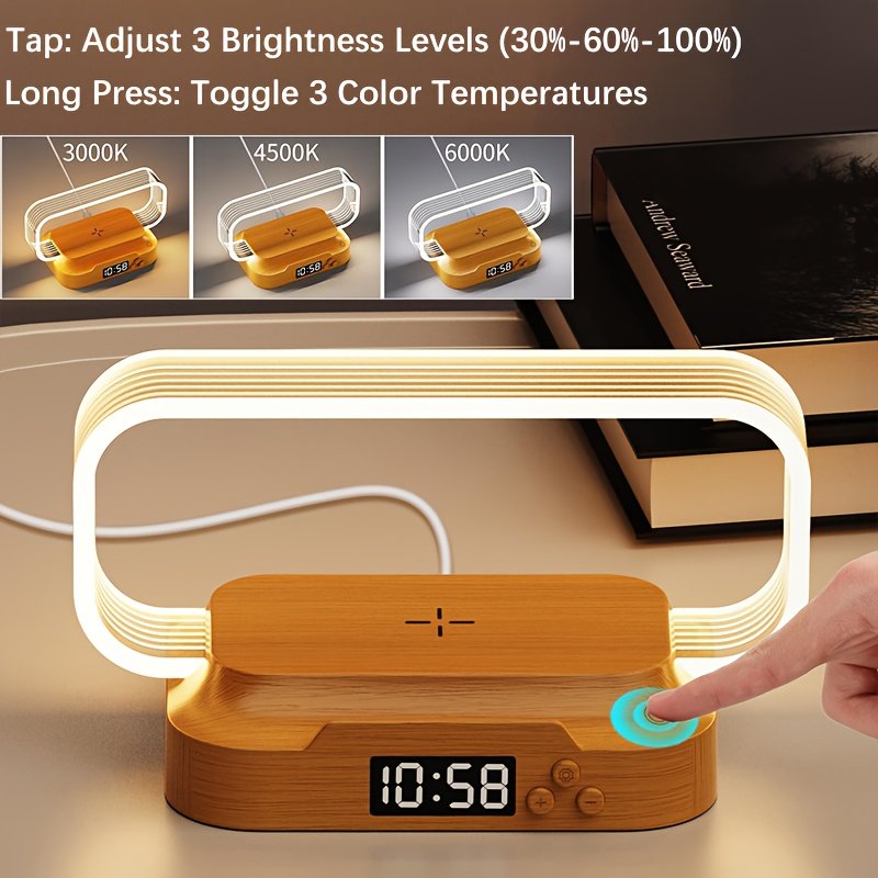 Specification: Multifunctional Wireless Charging Desk Lamp with Clock, 360° Soft Light & 3 Color Temperatures, 15W Fast Charge & Phone Holder, Touch Control for Study/Office/Fall Decor/Back-to-School, Study Lamp, Desk Accessory, Contemporary Lighting, Sleek Design, Highquality Finish, Plastic Construction, Multifunctional Light, Adjustable Brightness, Professionals, Remote Workers