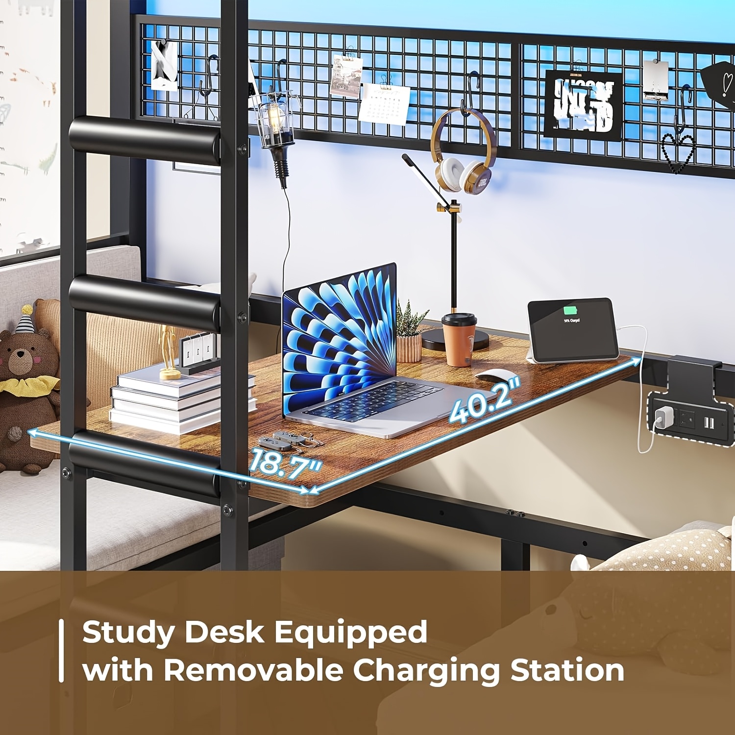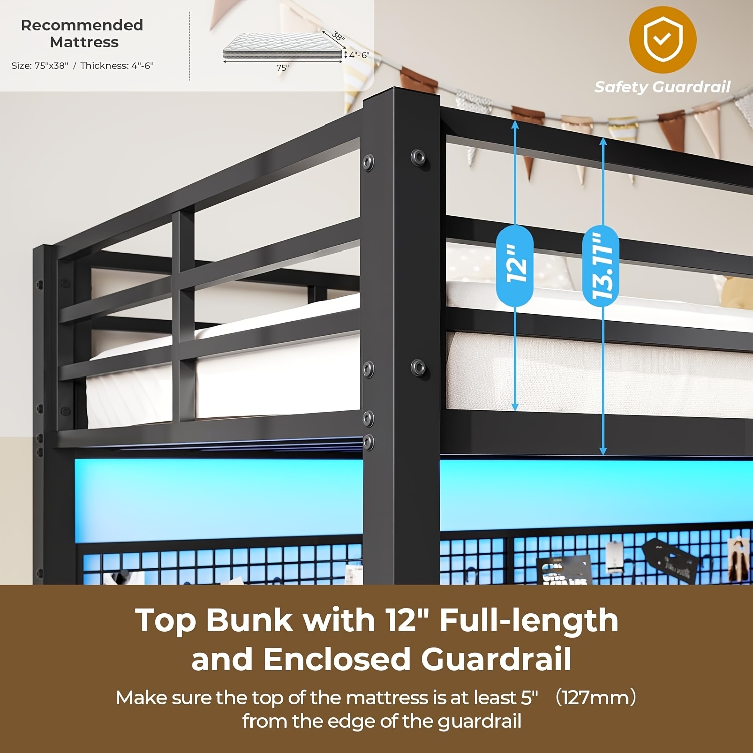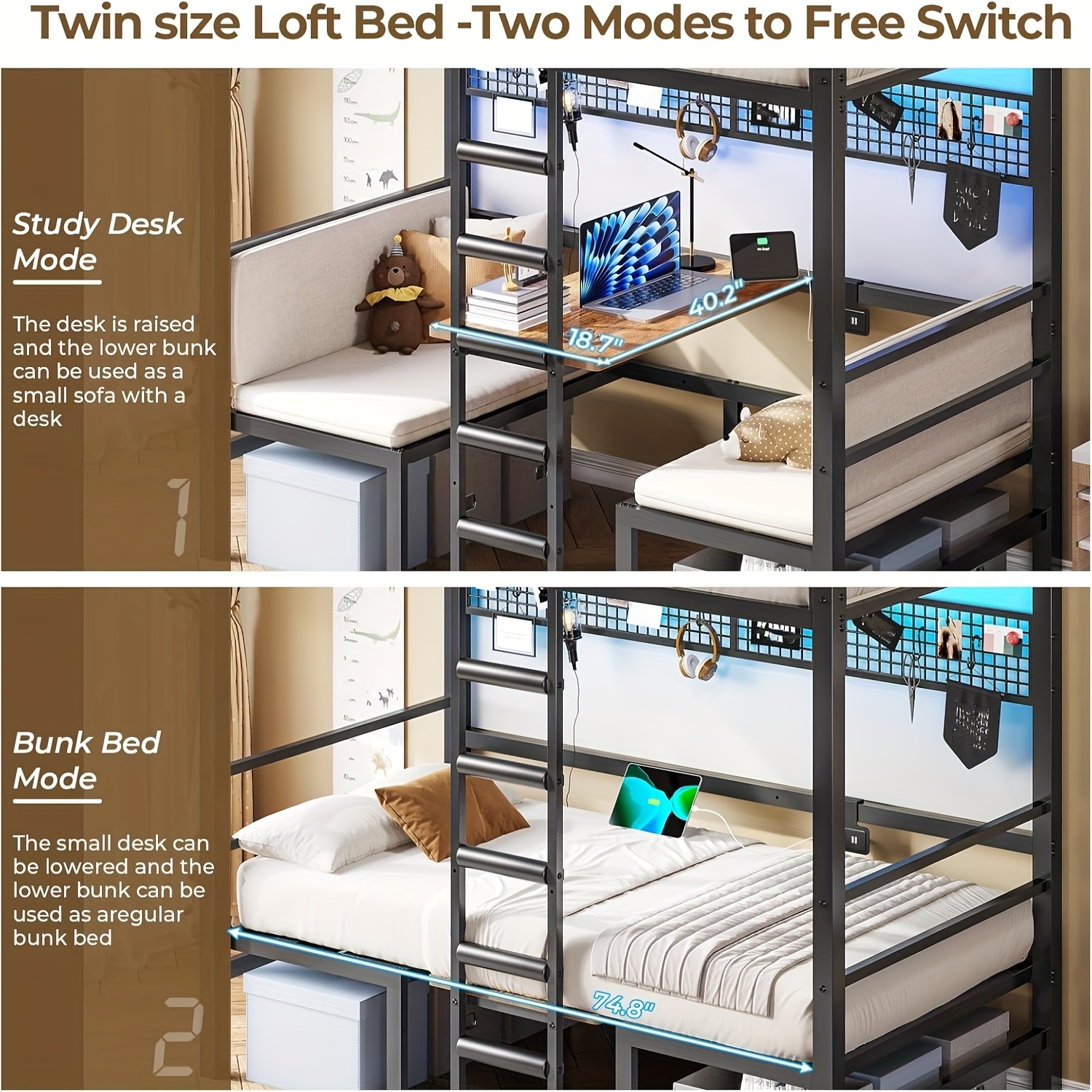Space-Saving Heavy-Duty Metal Loft Bed with Convertible Desk & Built-In Charging Station (2 USB/2 AC), APP/Key-Controlled RGB LED Lights, Safety Guardrails - Twin Over Twin Bunk Bed for Adults, Teens, Dorms, Small Rooms - No Wood Components, Easy Assembly, Dorm Room Furniture, Contemporary Bedroom Furniture, Safetyenhanced DesignSpace-Saving Heavy-Duty Metal Loft Bed with Convertible Desk & Built-In Charging Station (2 USB/2 AC), APP/Key-Controlled RGB LED Lights, Safety Guardrails - Twin Over Twin Bunk Bed for Adults, Teens, Dorms, Small Rooms - No Wood Components, Easy Assembly, Dorm Room Furniture, Contemporary Bedroom Furniture, Safetyenhanced Design
