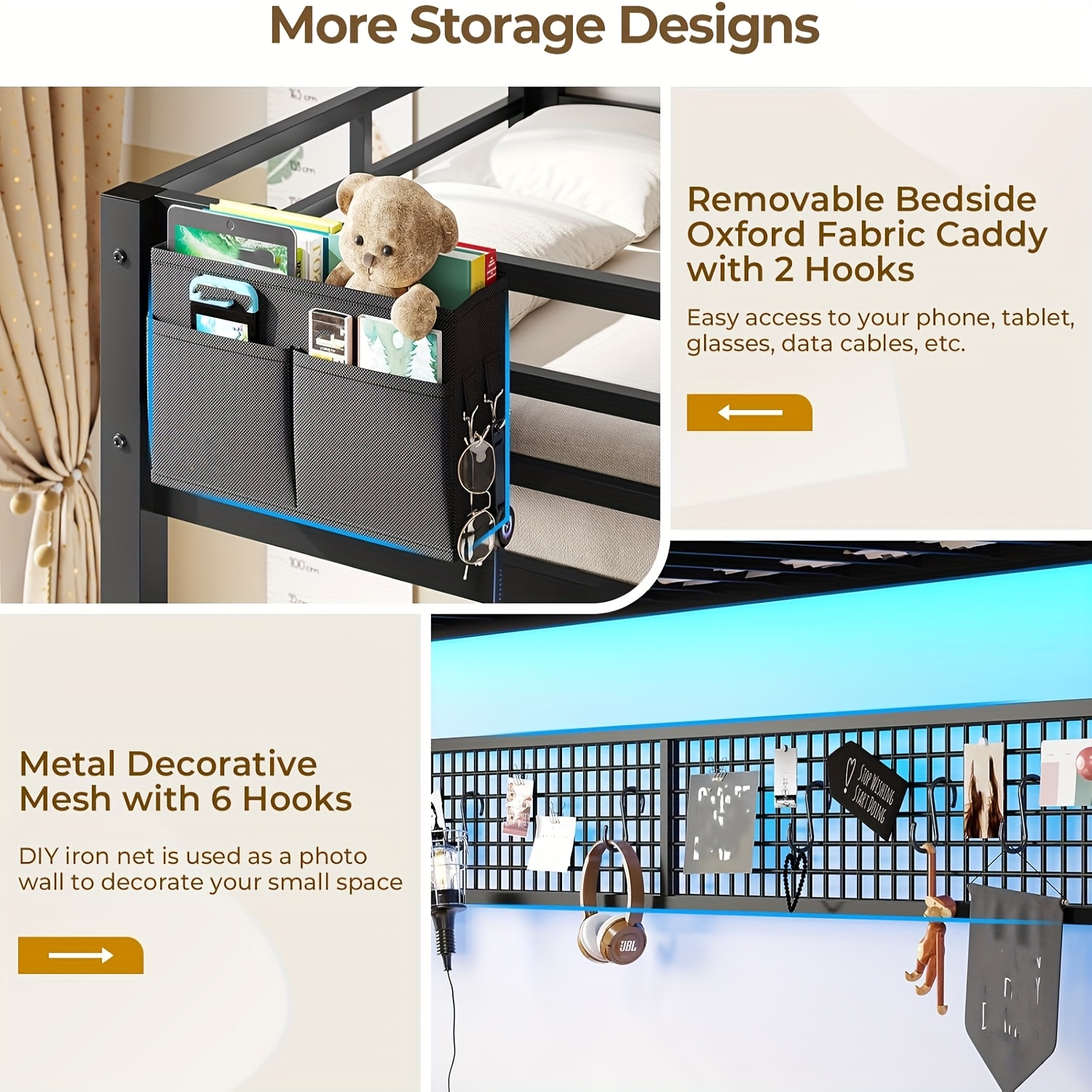 Metal Bunk Bed with LED Lights: The twin size bunk bed with RGB LED lights, remote control via APP, over 60000 colors for your to choose and you can customize the light brightness, flashing mode, music sync mode, microphone mode and timing mode. Or, simply adjust 7 colors via key control.