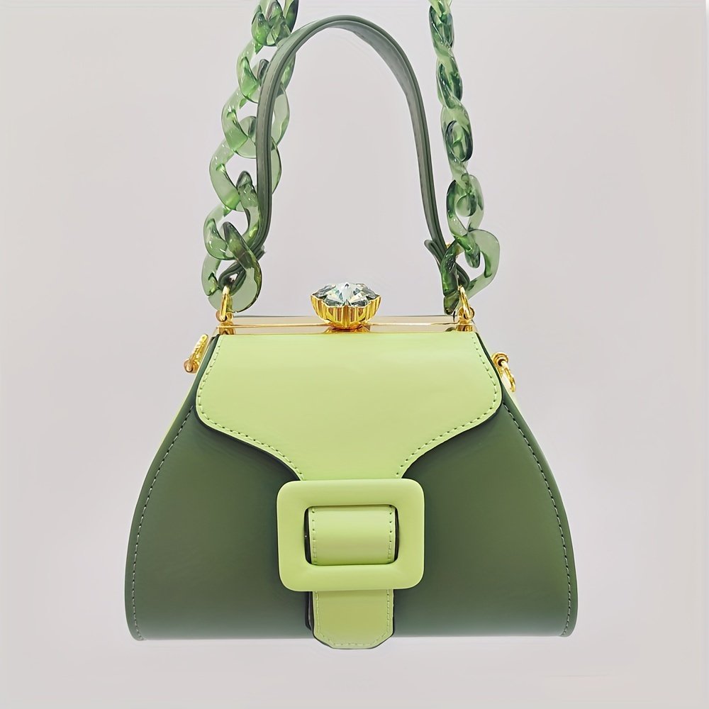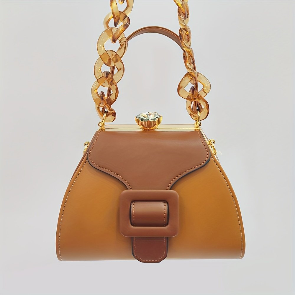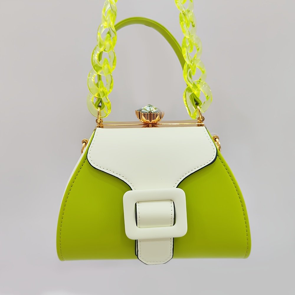 Stylish Two-Tone Round Handbag Made of Durable, Featuring a Detachable Acrylic Chain And Snap Closure. This Versatile Handbag Is Perfect for Both Parties And Everyday Use.