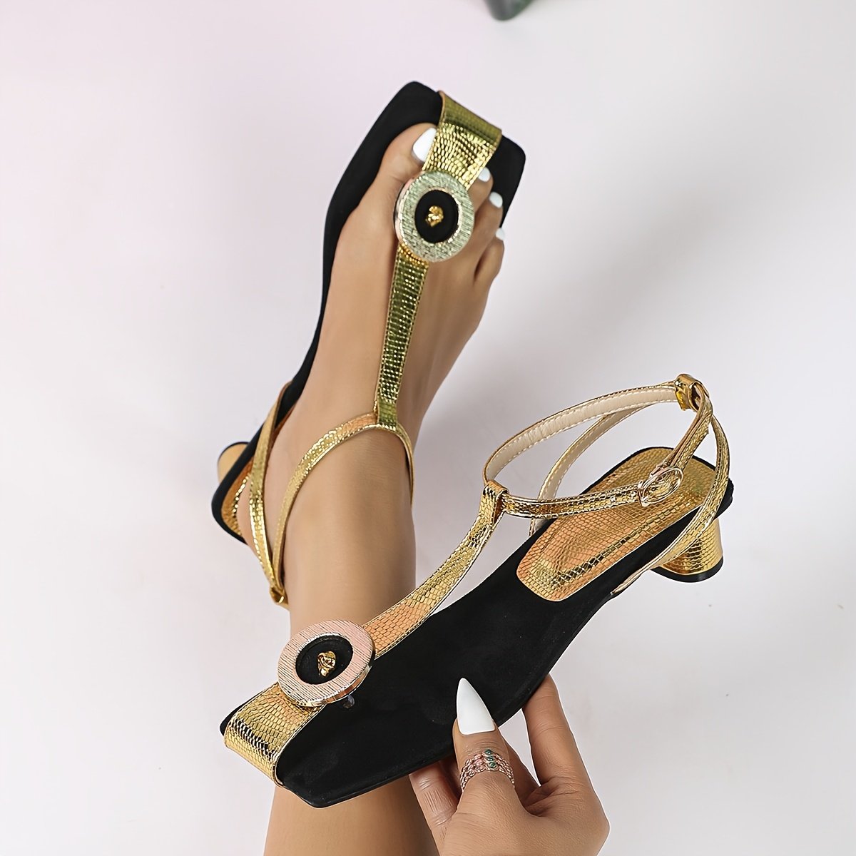 Women’s Black & Golden Gladiator Sandals – Square Toe, Chunky heel, Synthetic Cover – for Parties, Beach, Formal Events – Cushioned Insole & Non-Slip TPR Outsole – Summer Shoes, Chunky Heel Sandals, Party Footwear, Elegant Footwear, Embellished Details