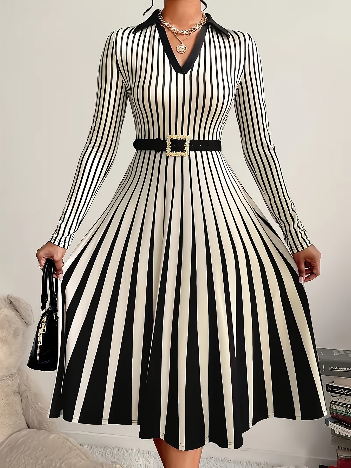Specification: Women’S Elegant Black & White Striped A-Line Midi Dress with V-Neck & Adjustable Waist Belt – Long Sleeve Casual to Semi-Formal Dress for All Seasons, Versatile Fashion, Classic Stripes, Quality Stitching, Office Wear