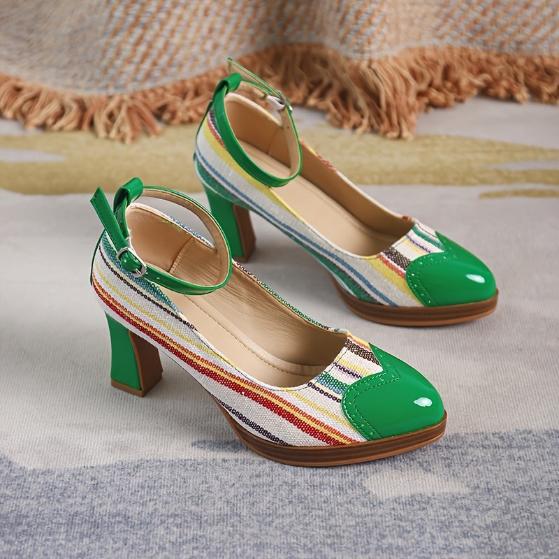 Women’s Retro Platform Mary Jane Shoes with Chunky Heel & Multi-Color Striped Design – Round Toe Faux Cover/Fabric Upper, Green/Beige/White/Black/Brown, Comfortable Block Heel & Arch Support, All-Season Casual to Formal Dress Shoes – Vibrant Striped Pattern, Chunky Heel Cushioned Insole, TPU Sole, Versatile for Casual Attire, Retro Style with Mary-Jane Strap & Buckle Closure, Sparkly Shoes for Women, Petite Pointed High Heel Shoes, Beige Shoes for Women Elegant Classy,